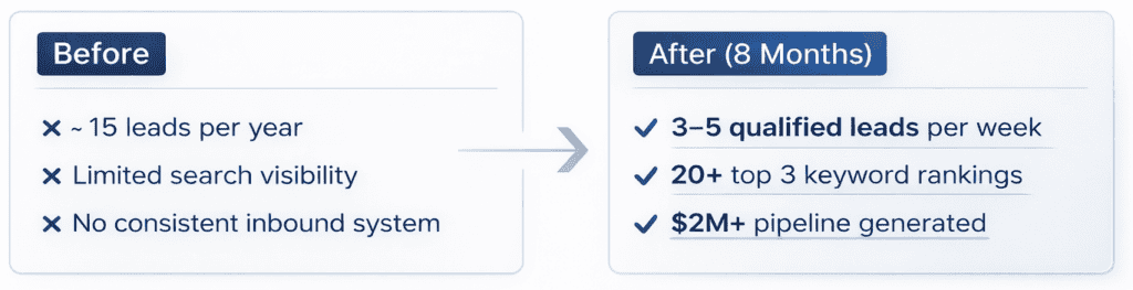 Within eight months, we transformed their digital presence into a predictable growth system, generating 3–5 qualified leads per week and over $2M in pipeline.